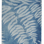 In this cyanotype, a single large fern takes center stage. It's like viewing the delicate details of a fern through a macro lens—only one section fills the frame, inviting you to explore its intricate patterns up close. Soft, airy blues gently fade into deeper shades of indigo, giving the piece a calming, sunlit feeling, like resting beneath a canopy of leaves on a quiet afternoon. A few scattered maple and oak leaves drift softly near the bottom, adding subtle natural details.