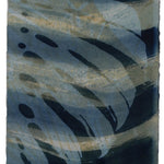 Deep, layered blues ripple across the cyanotype, revealing the graceful half of a Monstera leaf. Gentle wave patterns sweep over the artwork, subtly mingling sandy gold tones with the rich indigo background. The textures suggest quiet movement, like watching the ocean's surface softly sway underwater. Each detail invites a closer look, showing intricate textures and gentle layers from multiple exposures.