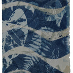 Soft indigo and cream tones ripple across this cyanotype, reminiscent of leaves drifting gently downstream. At the center, a tropical leaf shaped like half of a heart adds intrigue and warmth to the composition. Ferns appear in detailed layers, while maple and oak leaves subtly blend into the design. Through the double exposure, deeper layers emerge beneath the waves, inviting a closer look at nature’s quiet intricacies.