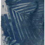 Palm fronds fan outward dramatically in sharp lines across the cyanotype, evoking the energy of waves crashing against rocks. Subtle yet distinct linear details flow dynamically, enhancing the movement within the layers. Soft silhouettes of scattered leaves drift gently around the strong angles of the palm, capturing a sense of natural rhythm in shades of muted and rich blues.