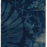 Deep shades of midnight blue blend beautifully in this piece, highlighting the silhouette of two half Monstera leaves. Soft, organic shapes like rice stalks and smaller foliage float gently throughout the composition, creating subtle layers. The rich background and delicate details capture the quiet calm of twilight in a garden, inviting a closer look to appreciate the hidden textures.