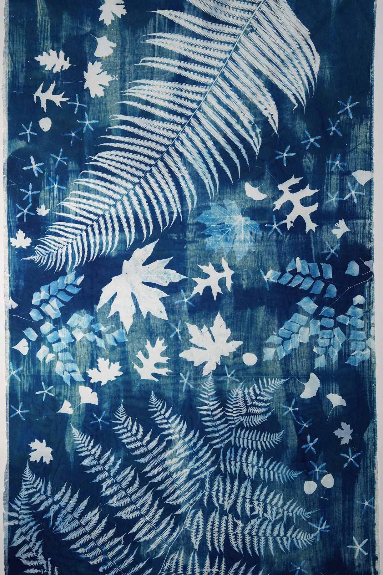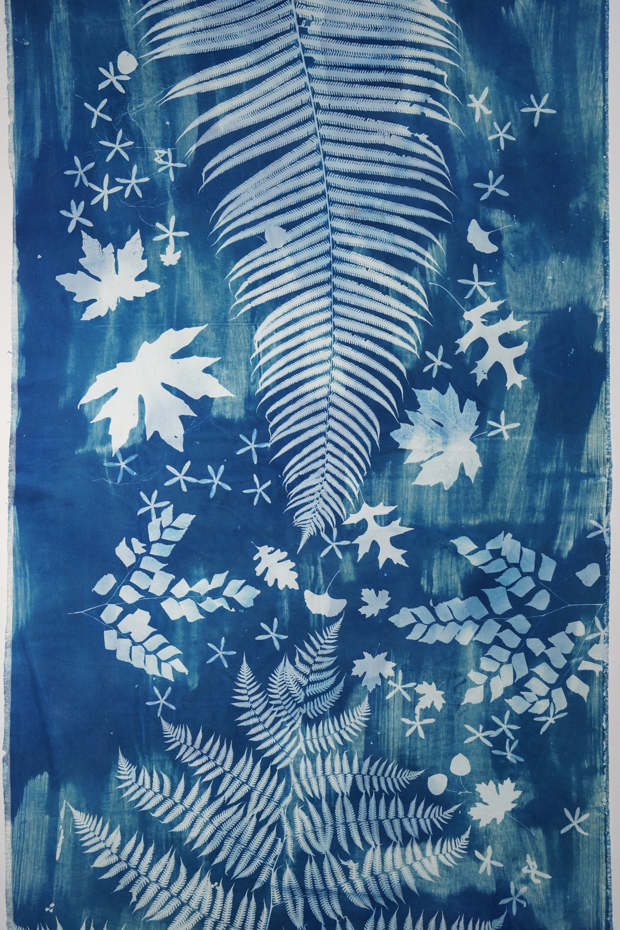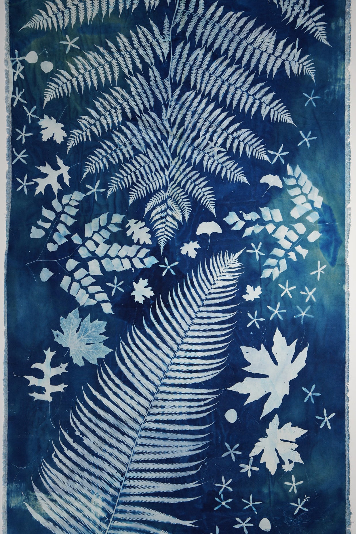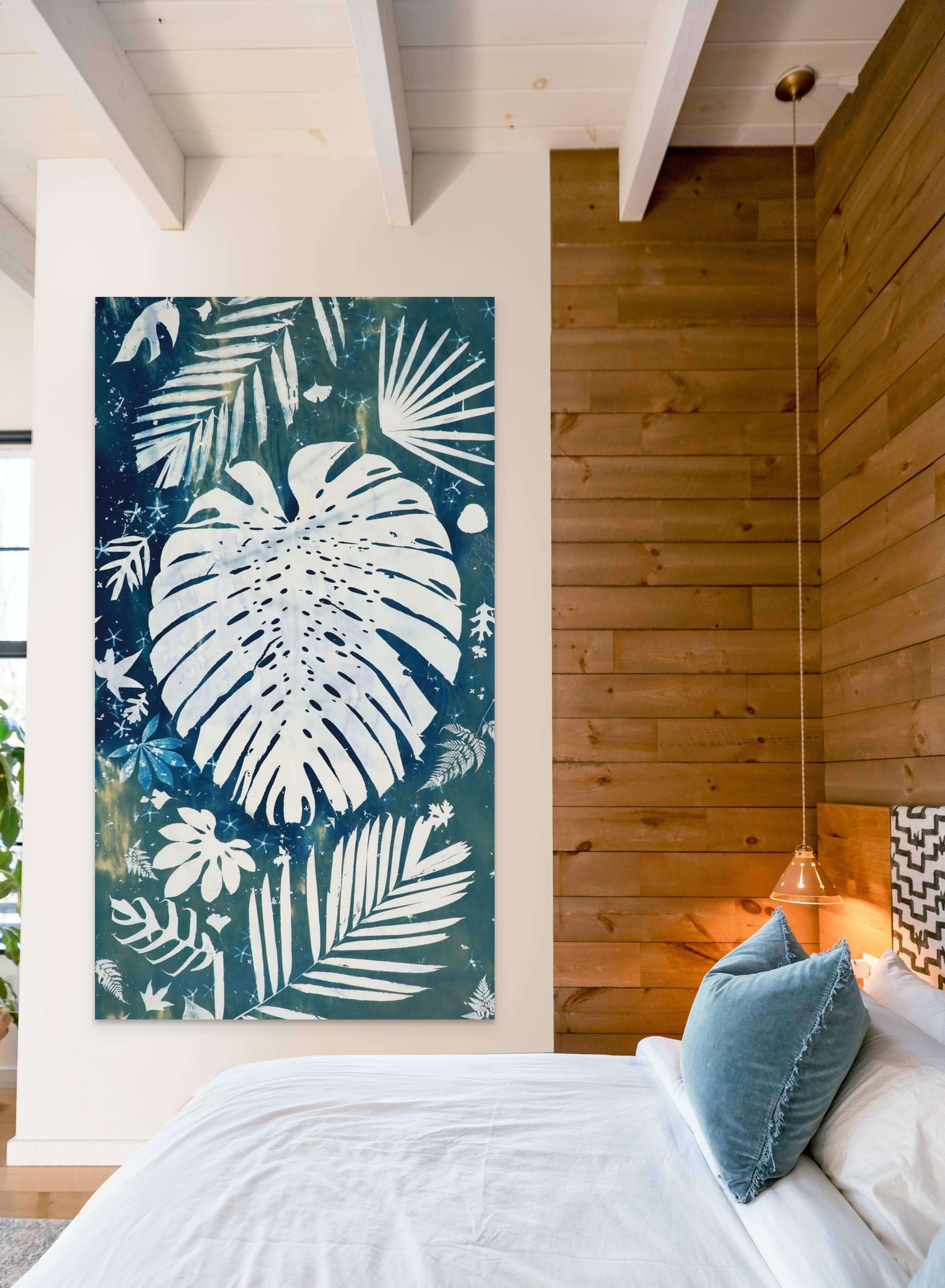 Elevate your living space with a touch of nature with this large-scale, 4 by 8 feet original cyanotype. Its deep blues and detailed leaf patterns bring a peaceful, natural vibe to any room. Designed to harmonize with modern decor, this artwork serves as a captivating centerpiece, infusing your home with a soothing tranquility.