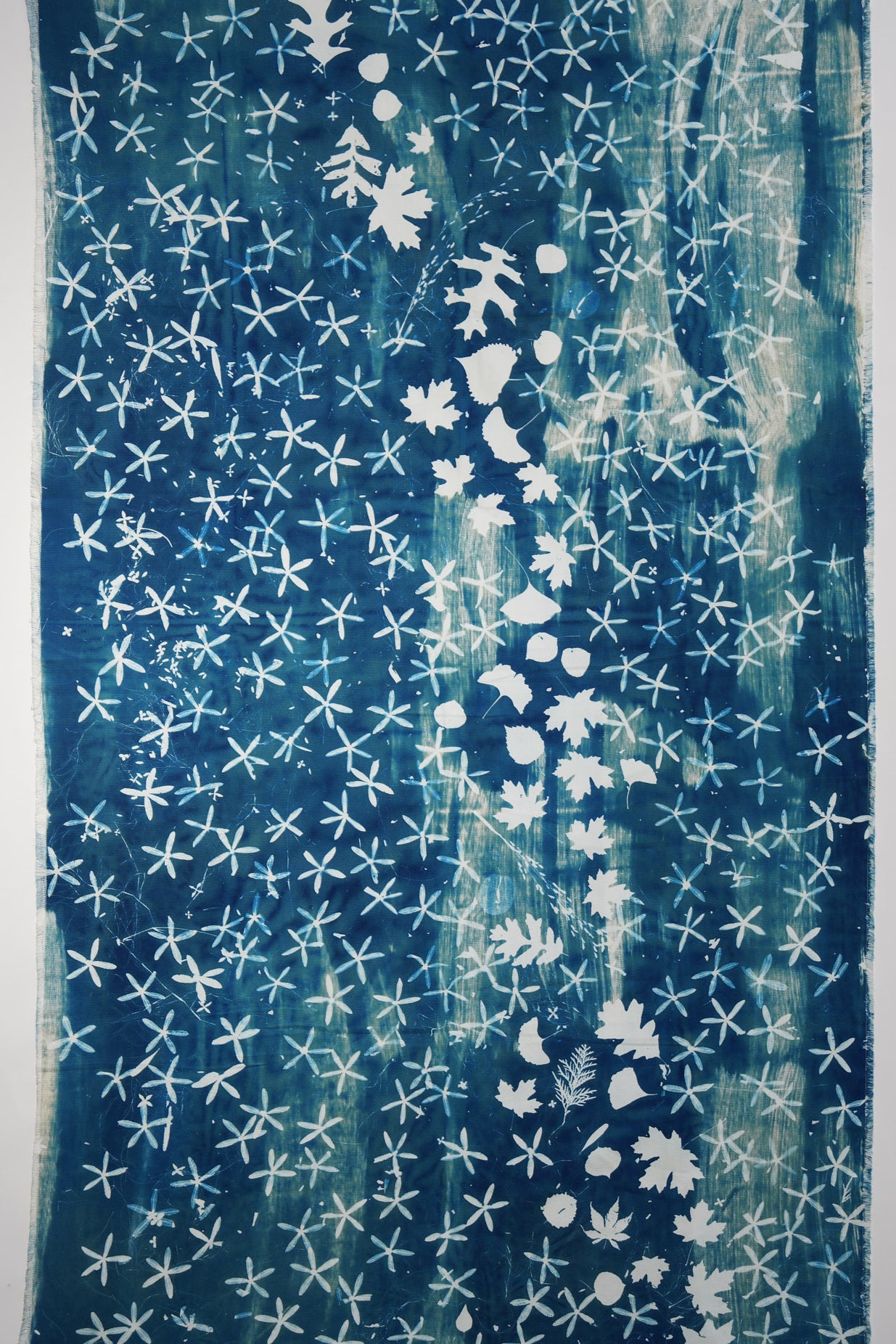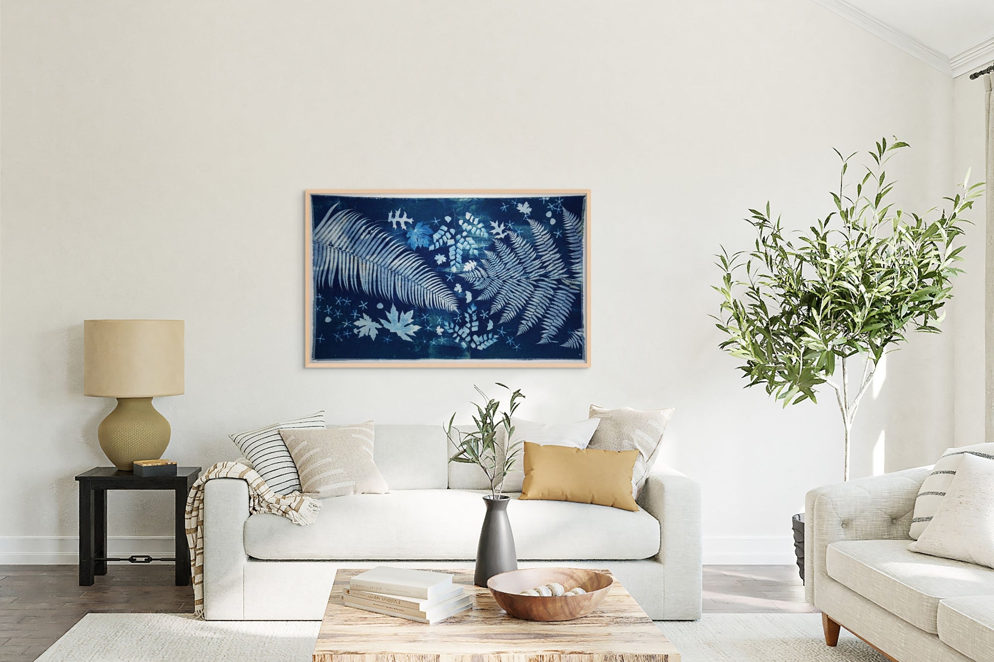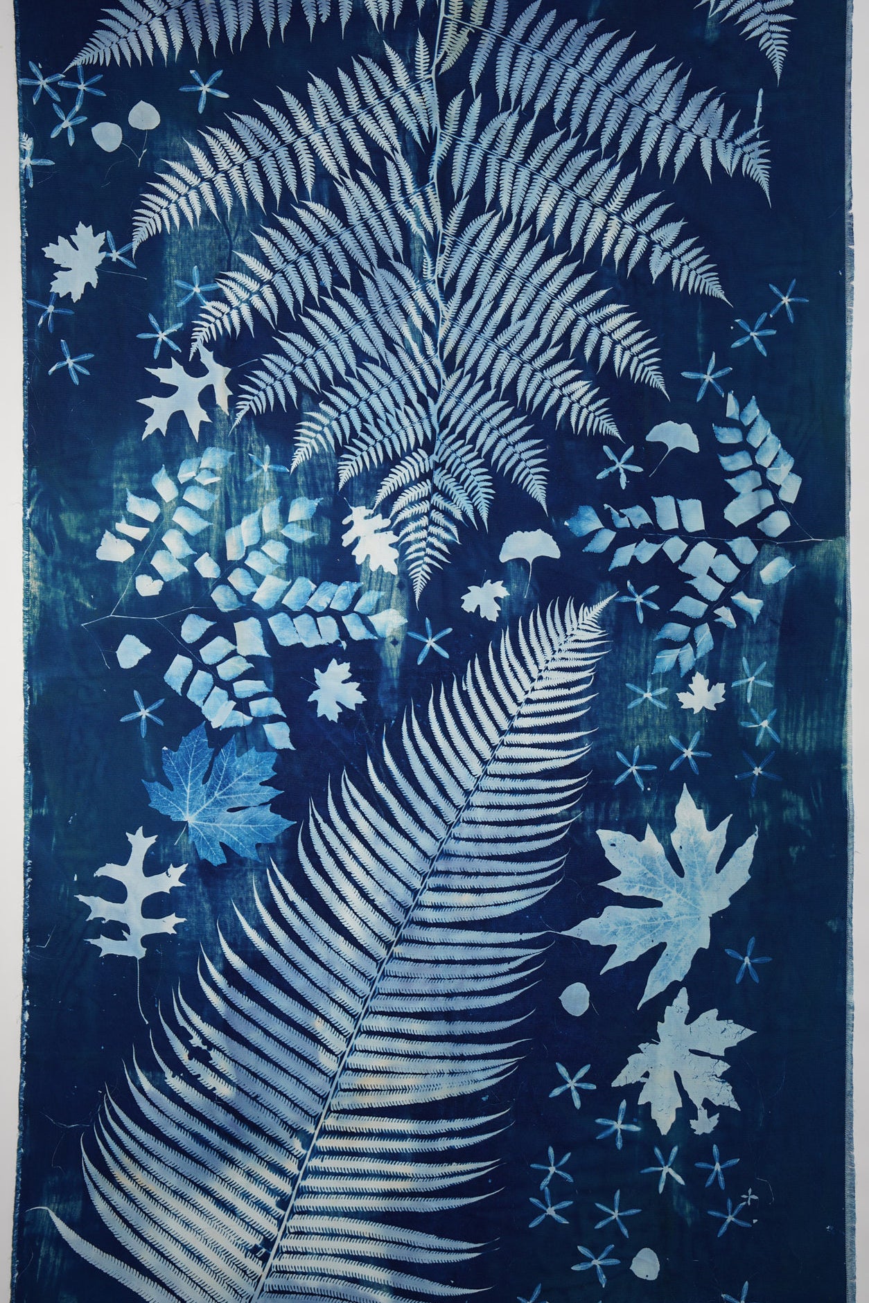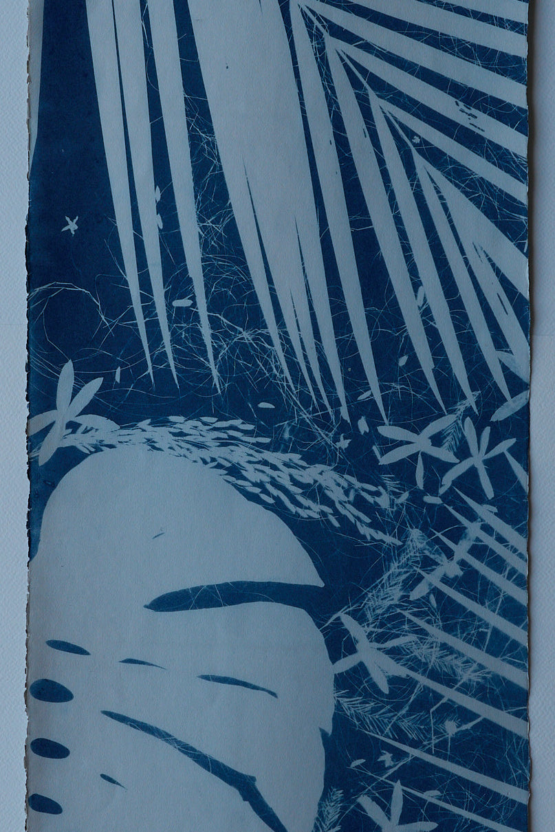 Elevate your living space with a touch of nature with this large-scale, 4 by 8 feet original cyanotype. Its deep blues and detailed leaf patterns bring a peaceful, natural vibe to any room. Designed to harmonize with modern decor, this artwork serves as a captivating centerpiece, infusing your home with a soothing tranquility.