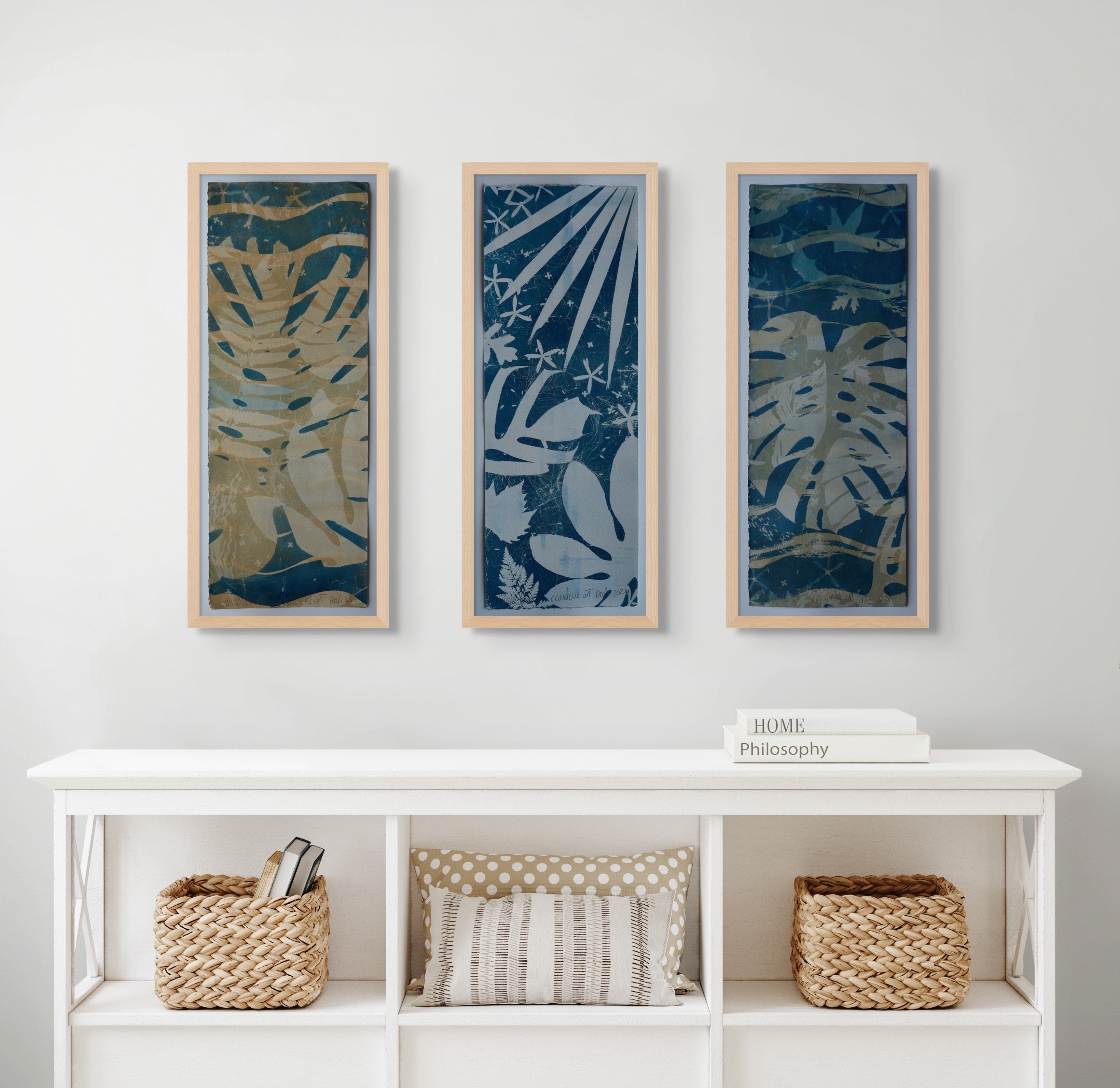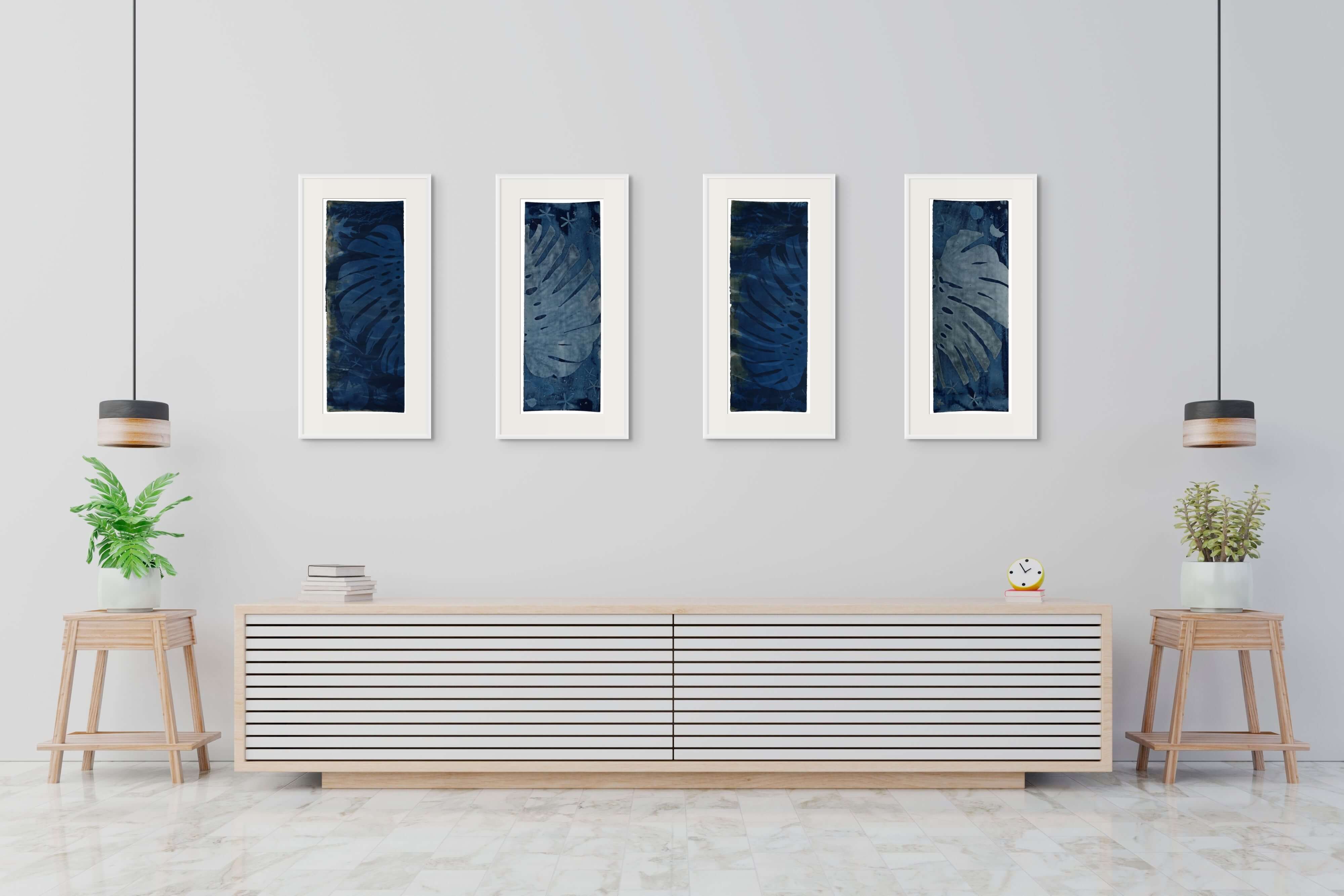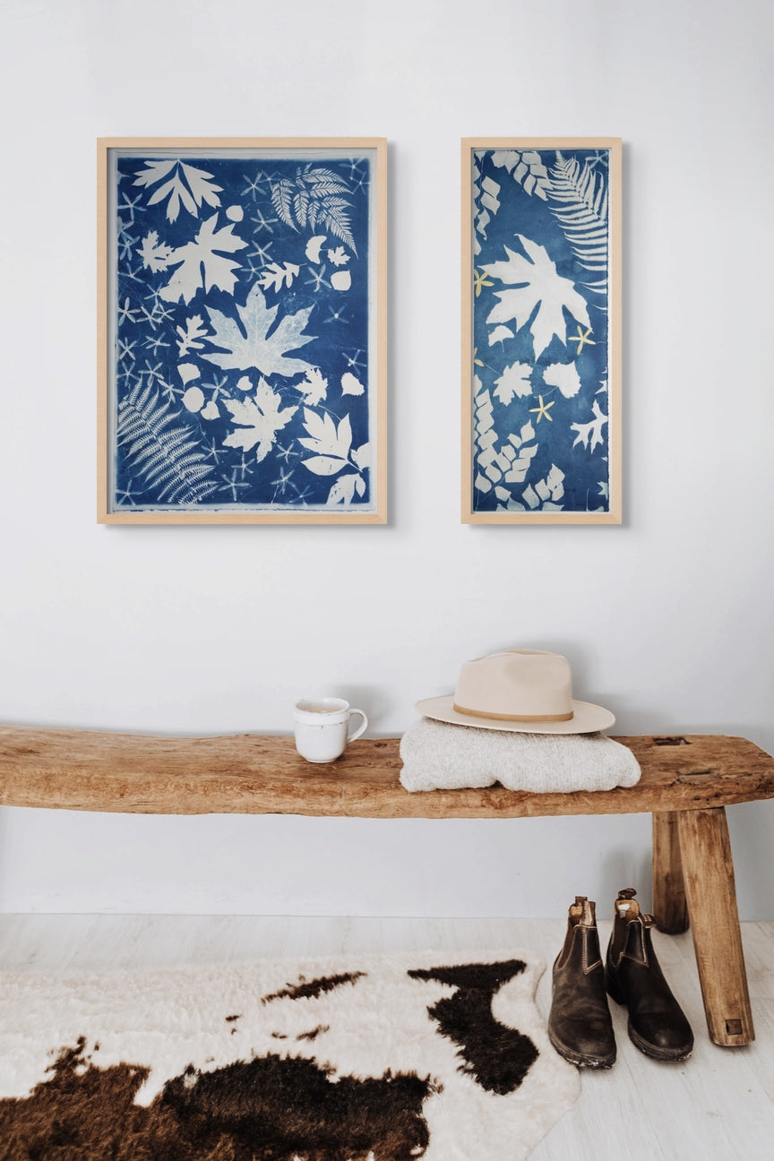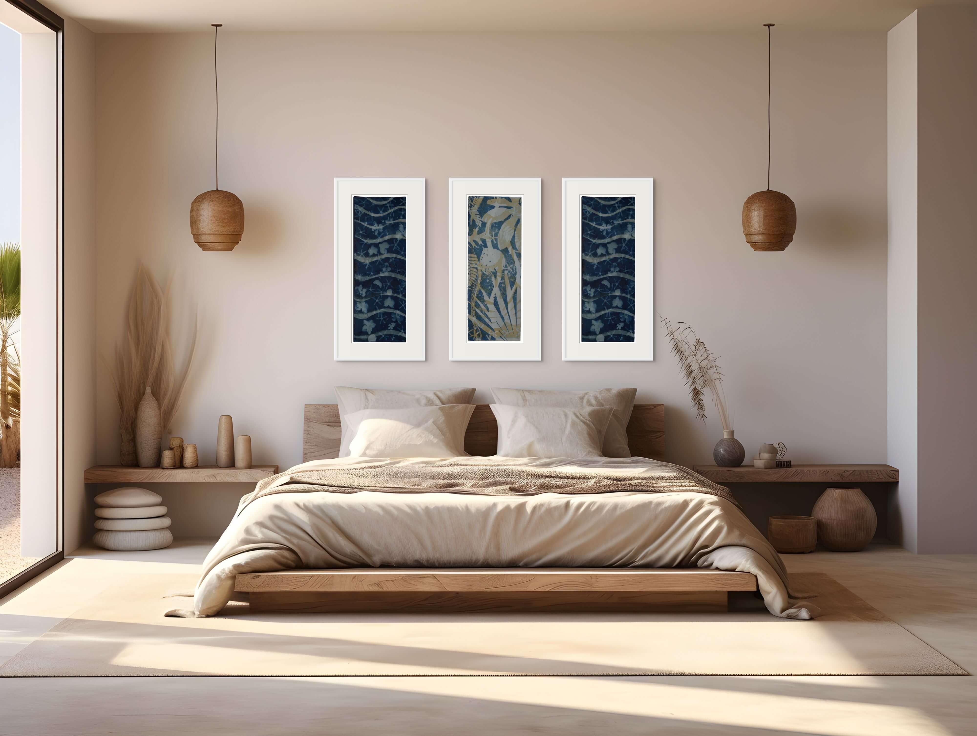 Explore the ideal arrangement for your space with my collection of original cyanotypes. Choose from three paper sizes or make a statement with large 4 by 8 feet pieces on cotton. Enjoy the freedom to mix, match, and play with different configurations to reflect your unique style, all complemented by the option of custom frames. Browse through the example images below for inspiration to enhance various settings—be it your home, office, or a hotel. Whether it's adding vibrancy to a living room, tranquility to a bedroom, calm to a bathroom, or a welcoming atmosphere to hallways and corporate spaces, these handpicked visuals are here to ignite your creativity and help you discover the perfect placement for my artwork in your environment.