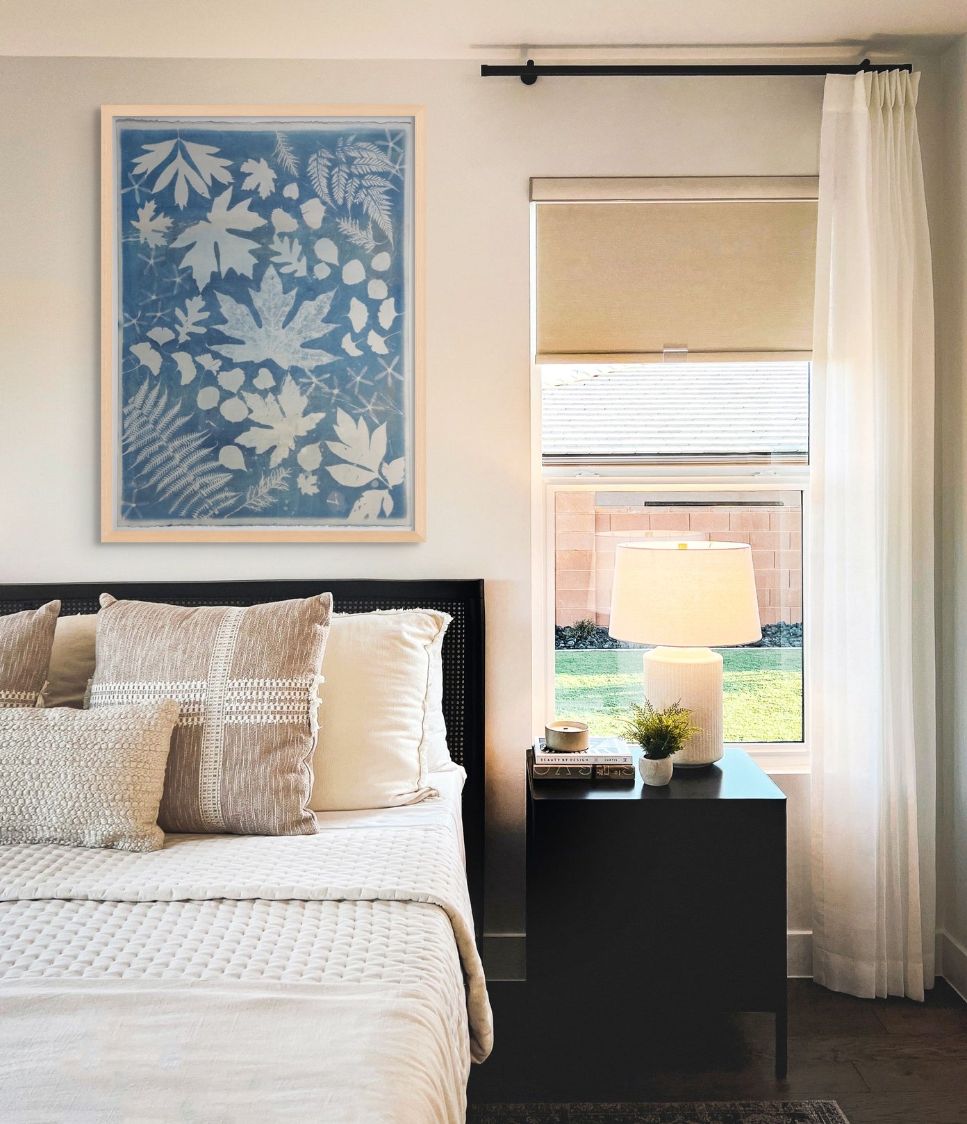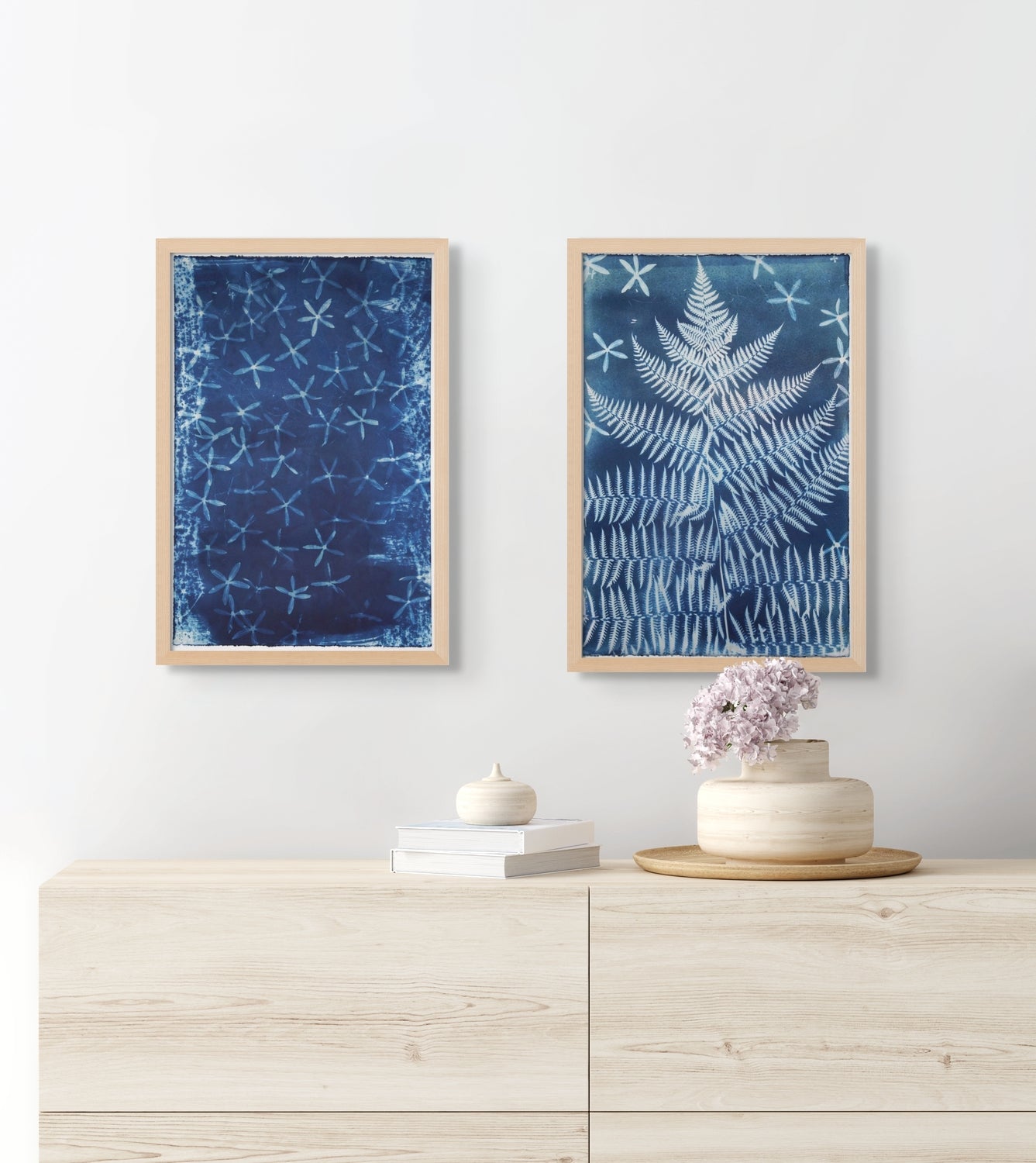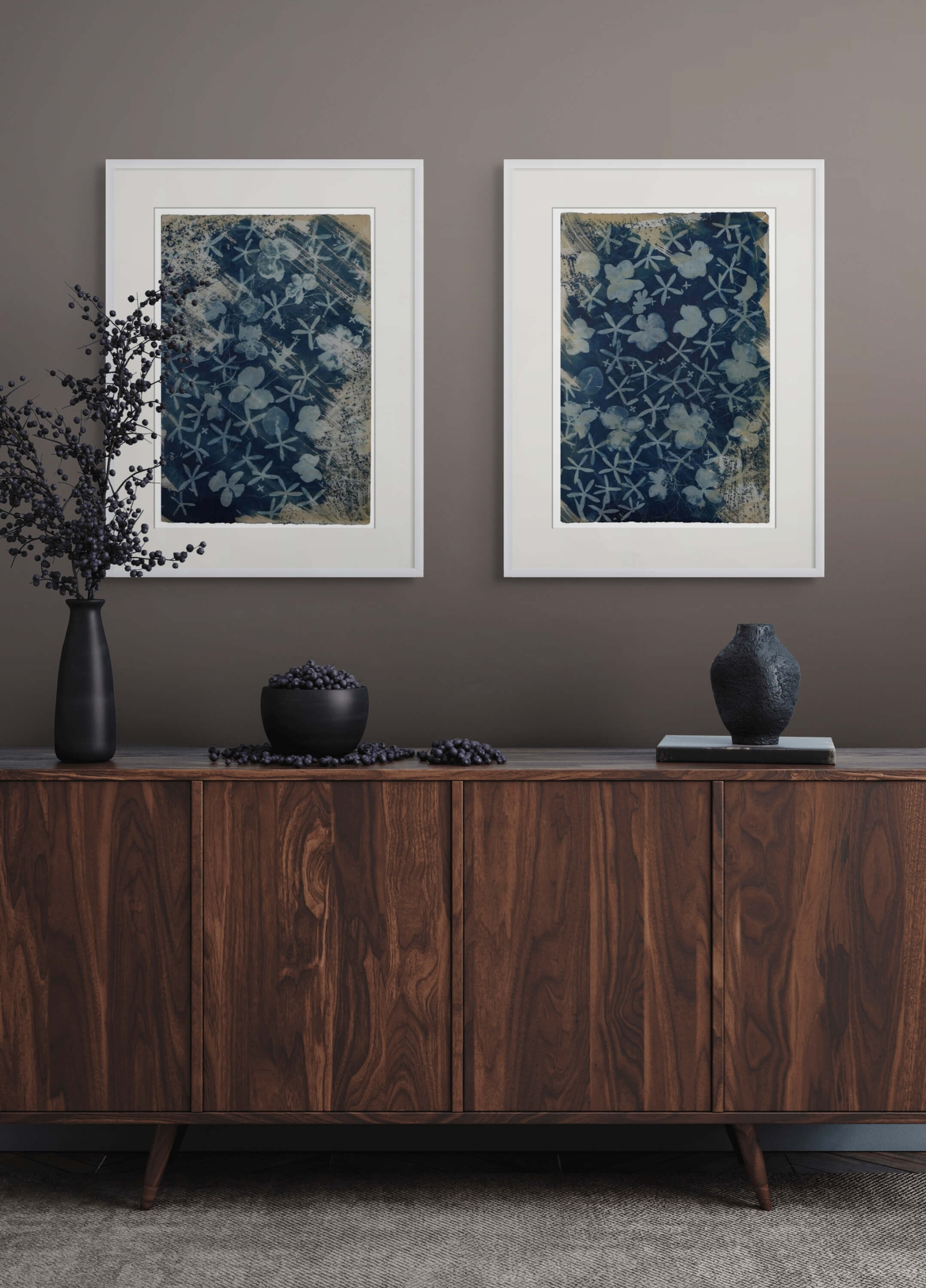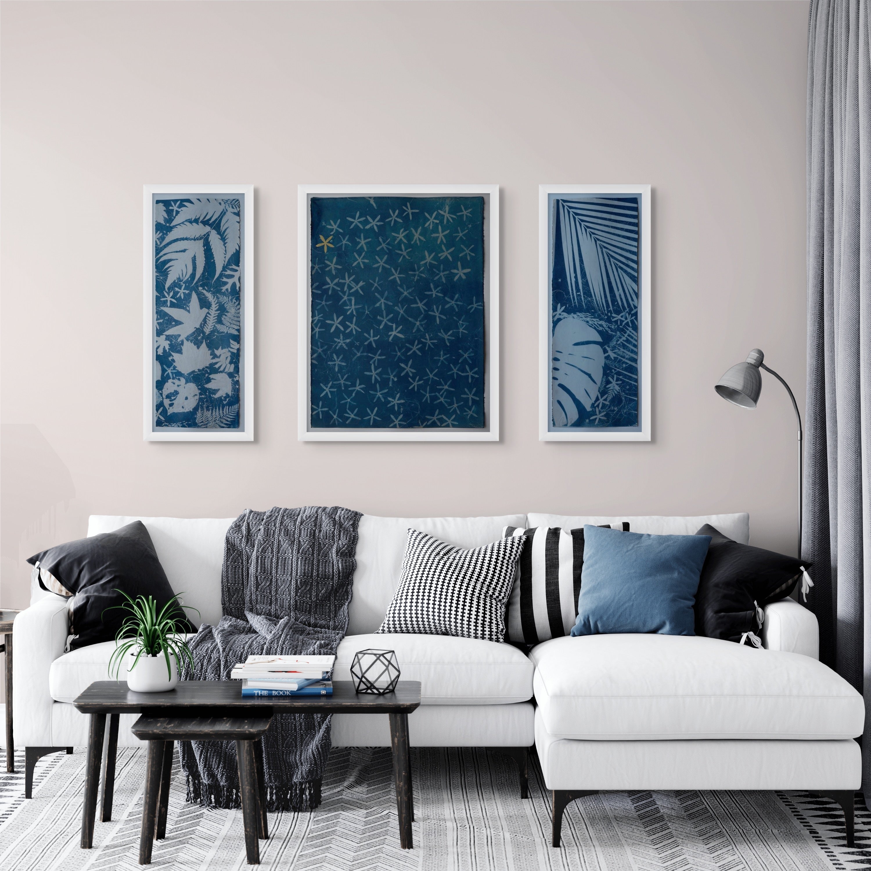 Explore the ideal arrangement for your space with my collection of original cyanotypes. Choose from three paper sizes or make a statement with large 4 by 8 feet pieces on cotton. Enjoy the freedom to mix, match, and play with different configurations to reflect your unique style, all complemented by the option of custom frames. Browse through the example images below for inspiration to enhance various settings—be it your home, office, or a hotel. Whether it's adding vibrancy to a living room, tranquility to a bedroom, calm to a bathroom, or a welcoming atmosphere to hallways and corporate spaces, these handpicked visuals are here to ignite your creativity and help you discover the perfect placement for my artwork in your environment.