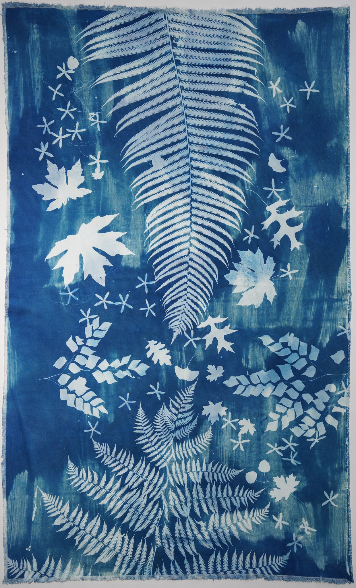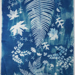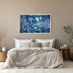 This piece feels like it was washed in early morning light. The blues here are cooler and softer, with gentle brushstrokes that give the background a peaceful, almost misty atmosphere. A tall fern rises through the center like a quiet breath, while another sits rooted at the bottom, full and layered. Scattered between them are oak, maple, ginkgo, and small round leaves, drifting through clusters of Queen’s Wreath vine blooms. Everything feels light and suspended, like the forest just before it wakes.