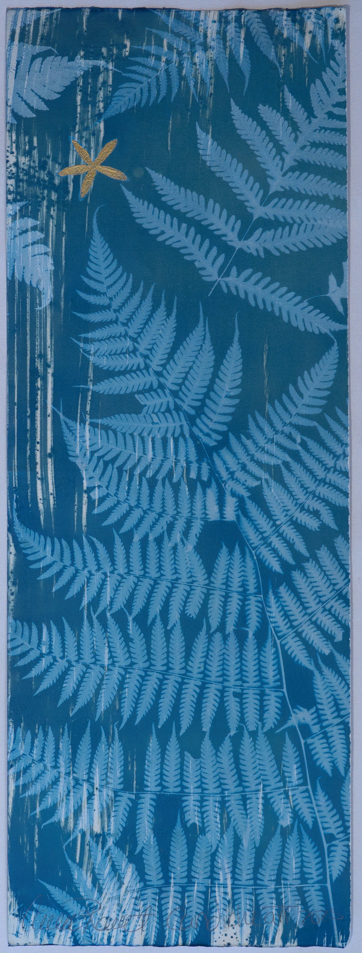 Fern fronds sweep across this cyanotype in long, gentle arcs, creating a soft feeling of movement. The background shifts through layered blue tones with visible brush marks from the hand-applied chemistry, adding a textured, painterly look. Star shaped flowers float in the open spaces, and several of them are hand-painted in gold, giving the piece warm highlights that stand out against the cool blues. The combination of delicate fern detail, smooth color transitions, and those bright gold stars keeps the whole artwork light, balanced, and easy to look at.
