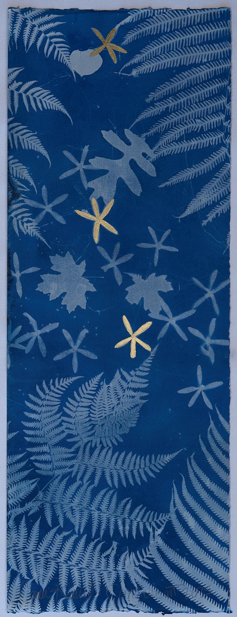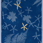 Fern fronds curve through this cyanotype in long, soft arcs, creating a gentle flow from top to bottom. In the open space between them are a few maple leaves with clear, bright silhouettes. Star shaped flowers drift through the composition, and three of them are hand-painted in gold, adding warm highlights that stand out against the deep blue background. The layered blue tones and subtle brush marks from the hand-applied chemistry give the whole piece a calm, airy feeling.