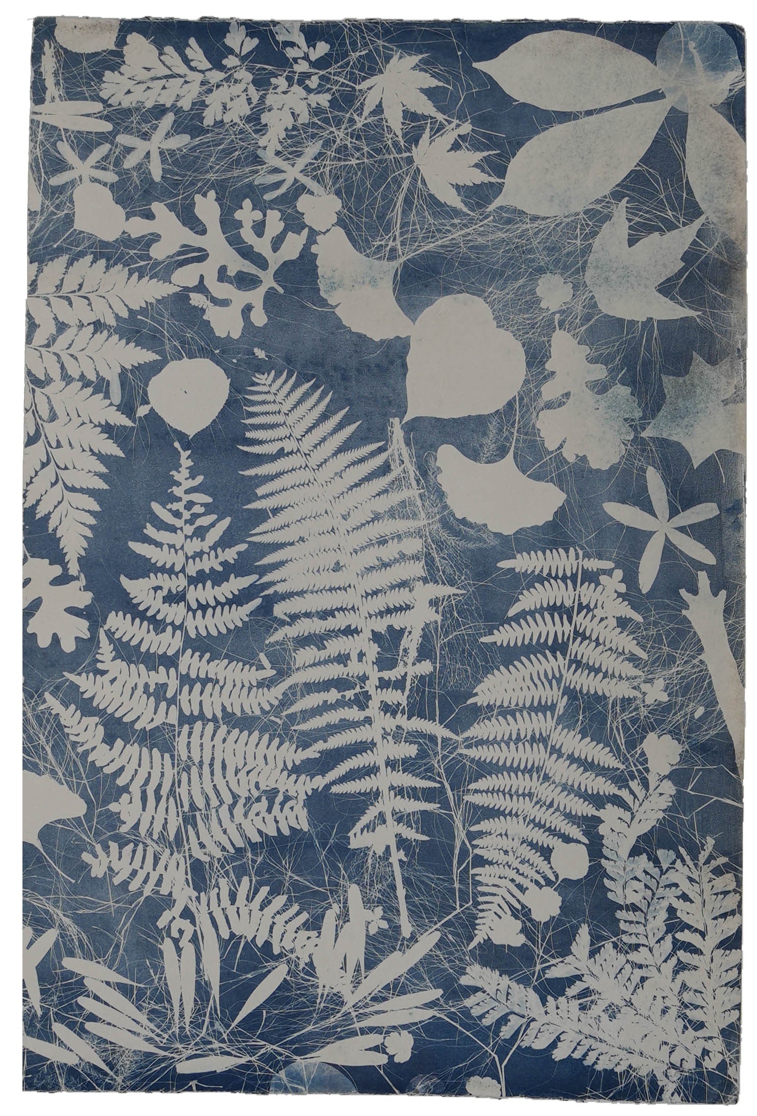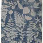 Graceful silhouettes of delicate ferns stretch upward through a captivating blend of soft blue tones. Among the ferns are subtle impressions of leaves from various trees, including the recognizable shapes of maple and oak. Each element combines harmoniously, creating a gentle interplay between intricate botanical detail and the calming hues of the cyanotype process. The layers of texture and tone invite contemplation, evoking a serene walk through a lush, quiet woodland.