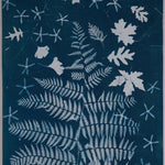 A tall fern rises through the center of this cyanotype, each frond showing soft detail that gives the whole piece a light, airy feeling. The background shifts between deep blue and muted teal, creating a calm, watery atmosphere.