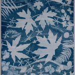 Large maple leaves drift across this cyanotype as if they’re floating on water. Soft waves of deep blue and teal move through the background and create a calm, steady rhythm that carries everything forward.