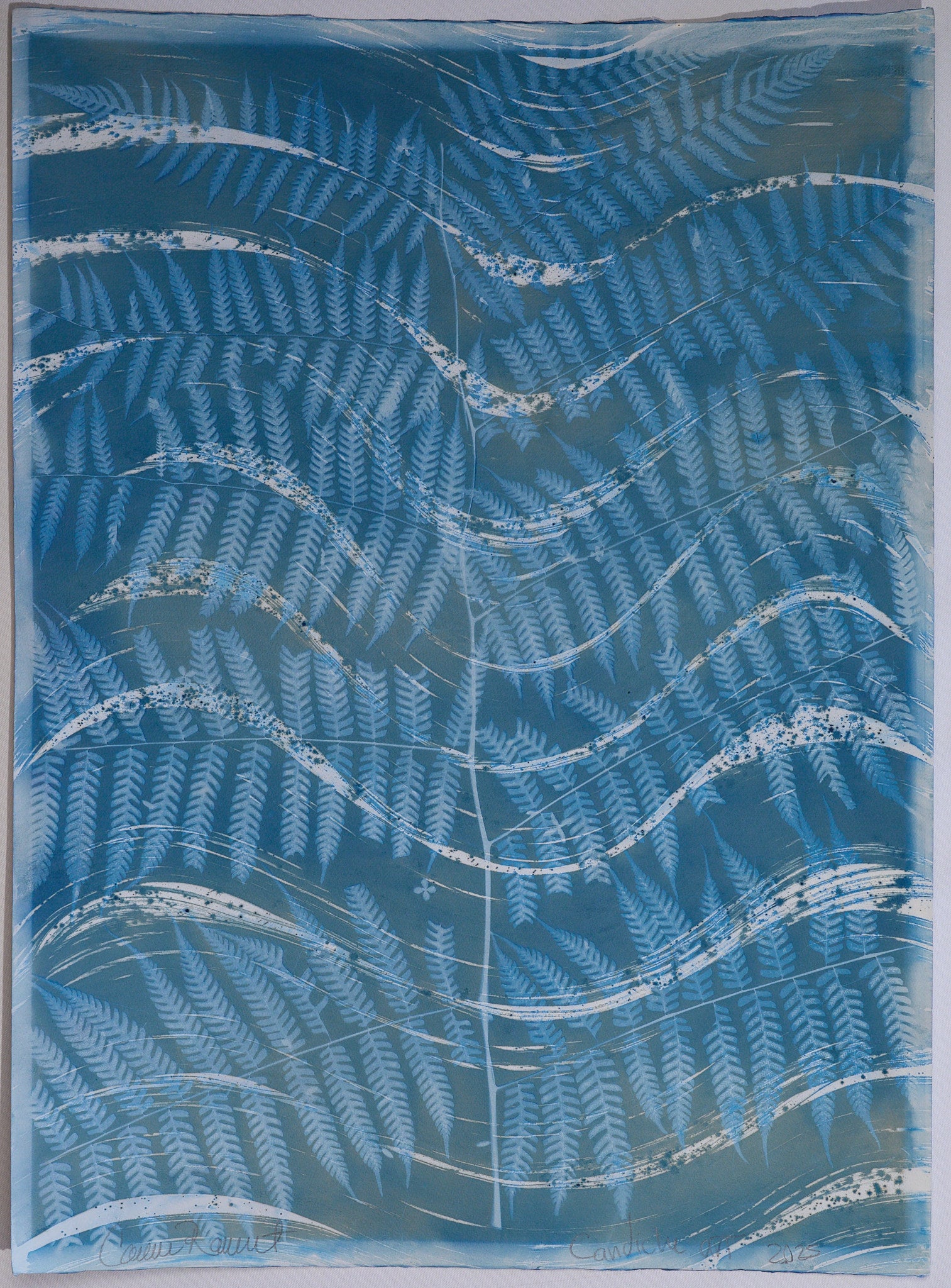 Fern fronds flow across this cyanotype in long, gentle lines, carried by soft waves that move through the entire piece. The background shifts between deep blue and muted teal, creating a quiet sense of motion, like water drifting past.