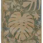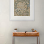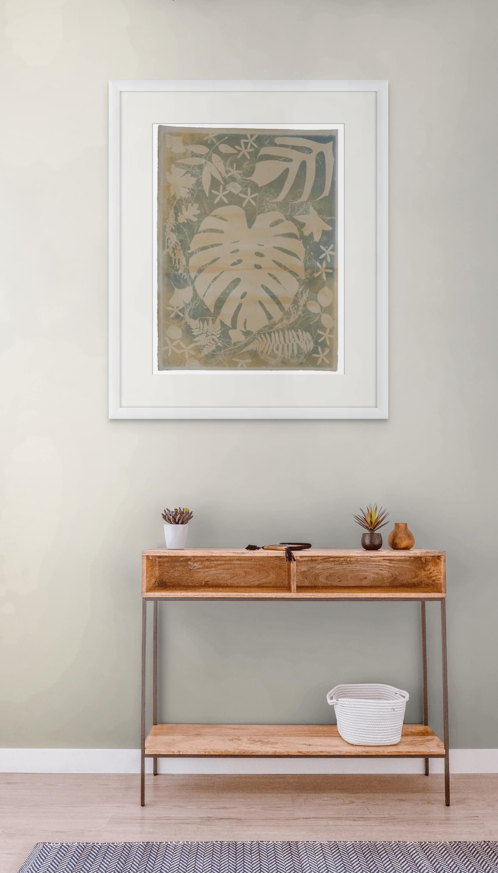 This cyanotype features warm, sandy tones blending into gentle greens, giving it an earthy and inviting feel. A large Monstera leaf is the focal point, surrounded by ferns, delicate Queen’s Wreath vines, and smaller tropical leaves, creating a harmonious and organic composition.