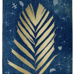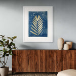 This artwork features a palm leaf hand-painted in gold, beautifully contrasted against deep, rich blues. Queen's Wreath vines and subtle leaf shapes appear in the background, adding depth and dimension. The delicate patterns and striking color combination evoke a feeling of calm, starry nights in tropical landscapes.
